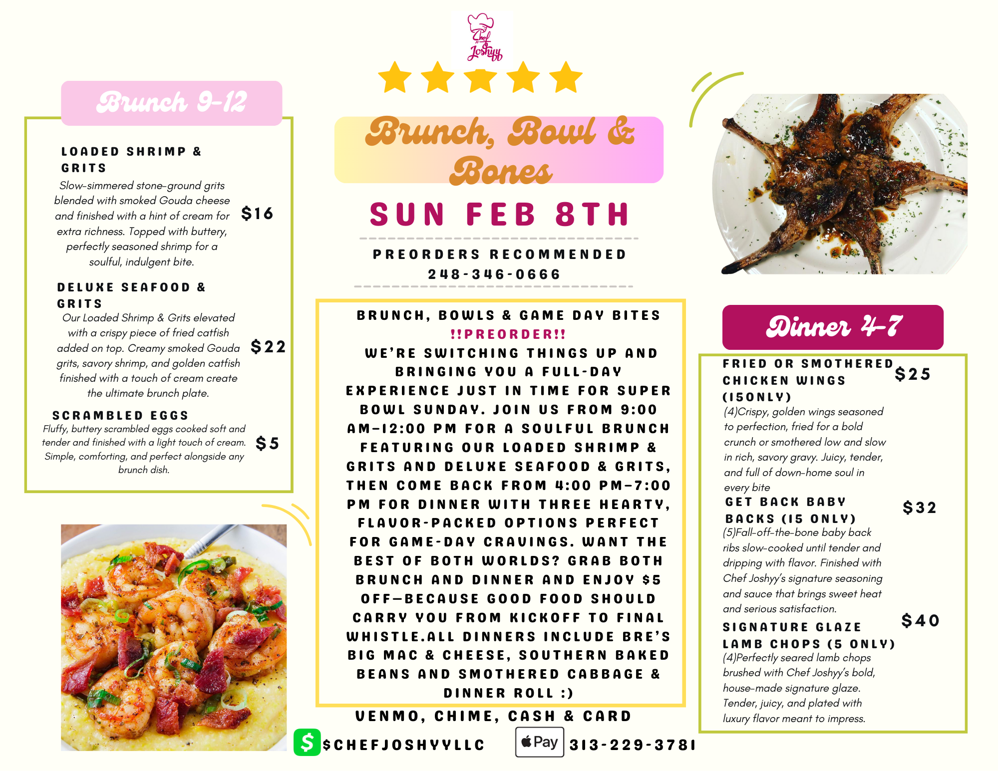 We’re switching things up and bringing you a full-day experience just in time for Super Bowl Sunday. Join us from 9:00 AM–12:00 PM for brunch featuring our Loaded Shrimp & Grits ($16) and Deluxe Seafood & Grits ($22), then come back from 4:00 PM–7:00 PM for dinner with your choice of fried or smothered chicken wings ($25), Get-Back Baby Back Ribs ($32), or Signature Glaze Lamb Chops ($40). All dinner meals include three classic sides—Bre’s Big Mac & Cheese, Southern-style baked beans, and smothered cabbage. Want the best of both worlds? Purchase both brunch and dinner and receive $5 off your total. Pre-orders are highly recommended to ensure availability—come eat, relax, and let us carry you from kickoff to the final whistle.